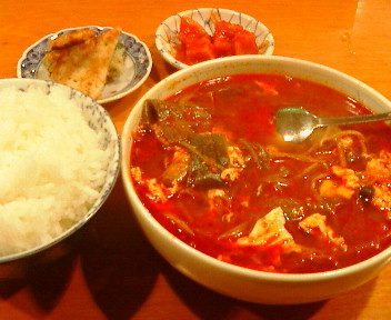 コメント:本格的な韓国料理屋です。ユッケジャン(゜o゜;) カラ〜ッ!辛い!久しぶりに頭の毛穴が開いた。。けど、(゜Д゜)ウマーー!美味い!。単に辛いだけではなく、コクのある奥深い辛さ、具財も豊富。小皿にチジミとカクテキが付いた。プチ情報
