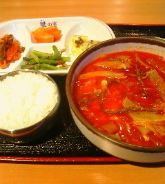 ユッケジャン、辛ら〜〜、でもコクがありウマー。香乙林と同等だ。ただ、こちらは長い春雨みたいのが入っており、スプーンで食うには汁跳ねが気になり慎重になる。しかし、何より嬉しいのは、キムチをはじめ4種の付け合わせが付いてくることだ。他に石焼ビビンバやカルビクッパなどがあり、リピートしたい。
