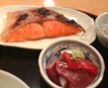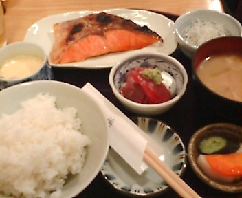 注文の品:鮭焼き定食(さけ焼、刺身、茶碗蒸、小鉢、漬物、ご飯(お替可)、味噌汁)