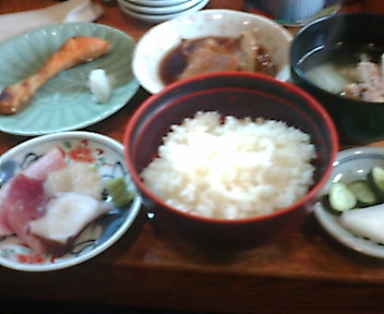 注文の品:焼き魚と魚煮付け(焼き魚・煮魚ハーフ、刺身、ご飯(お替り可)、アラ汁、漬物)