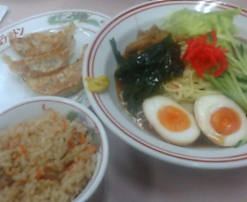 定番の餃子3個と炊込みご飯が付く。これが結構美味いんだ。冷しめんは、いわゆる冷やし中華。半熟の煮卵が嬉しい。ワカメとメンマとチャーシューが乗る。叉焼は刻んでほしかったな。