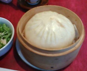 先にサラダと肉まん。すす、すばらしい・・(~ヘ~;)(~ヘ~;)。巨大! 本店のとは違い せいろで出てくる。くどさはなく美味い! 甘くなく向うとは別もの? 味付け変更?