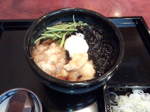 小海老天ぷらが5個ぐらい乗っている。温玉のとろっと感がたまらない。せりの香りがイイ(゚∀゚) & 磯海苔と辛味大根がこれまたいい風味を醸し出している。