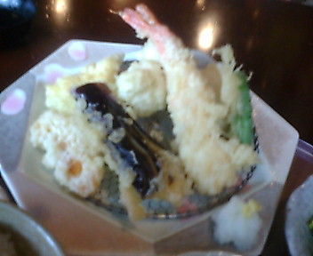注文の品:日替わりランチ・天ぷら定食(天然赤足海老とハモの天ぷら、小鉢、ご飯・味噌汁(お替可)、漬物)