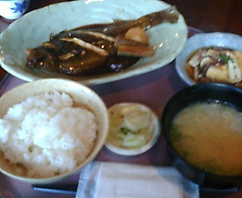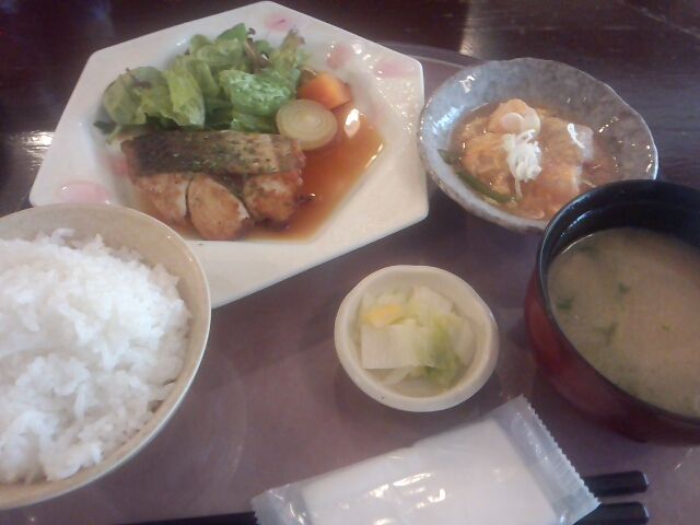 注文の品:日替わりランチ(魚メイン一品、小鉢、ご飯・味噌汁(お替可)、漬物)