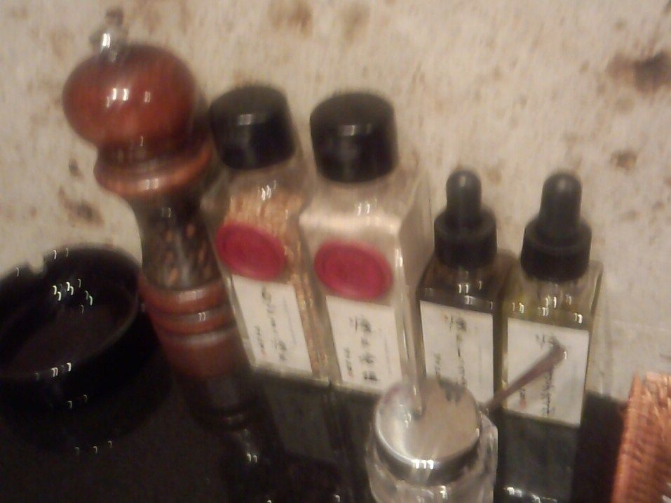 卓上に、塩、胡麻、胡椒、醤油、オリーブオイルの燻製調味料がある。醤油とオリーブは、化学の実験で使う様なスポイト仕様になっている。