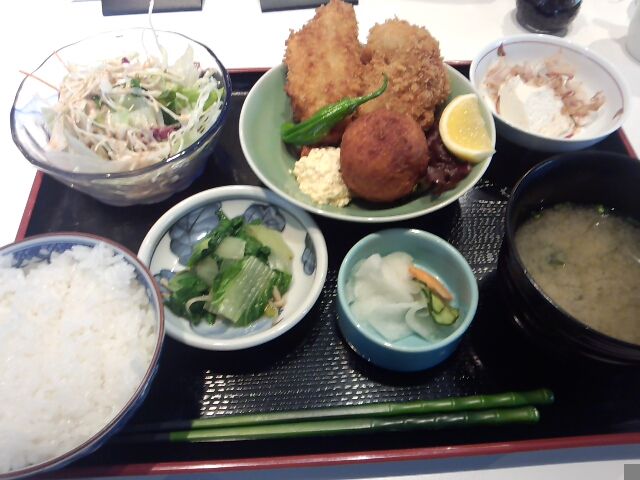 注文の品:本日のおすすめ「カニクリームコロッケ・天然アジフライ・地鶏カツ」(小鉢2、サラダ、ご飯(お替可)、味噌汁、漬物)