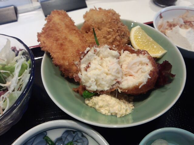 名物のカニクリームコロッケは、インチキではない蟹身がみっちりと詰まってます。余計な味付けがされてないベシャメルソースがくどくなくイイ。もちろんアジフライも臭味なくふわふわ。自家製タルタルもいい感じである。