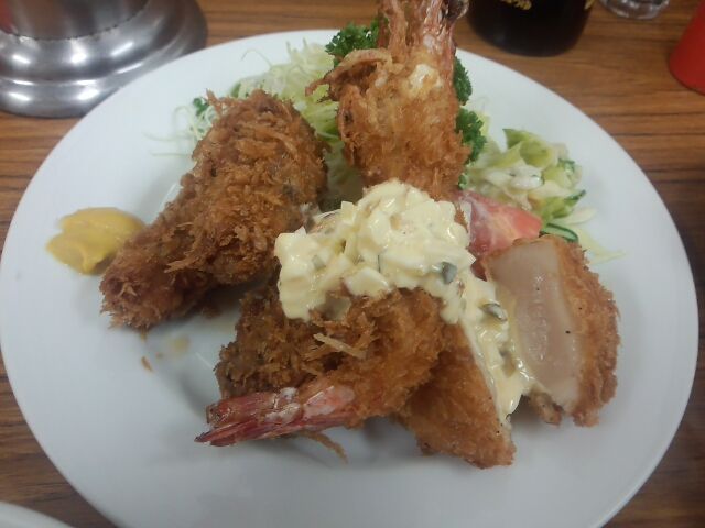 大きな二個合わせのカキフライ3個と、良質な車海老 & 肉厚で半生状態のホタテ、美味いです!! 車海老は頭までバリバリ食べれます。