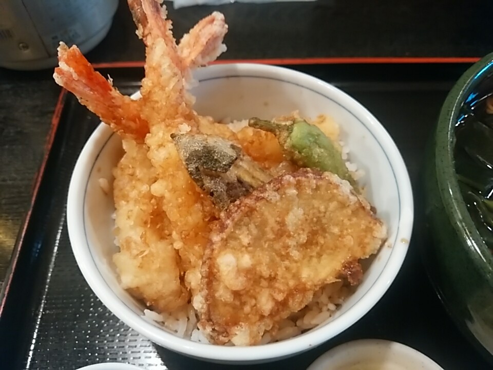 海老天が3本も乗っている。プリっとしてて、丼タレもいい感じに甘辛く美味しいです。