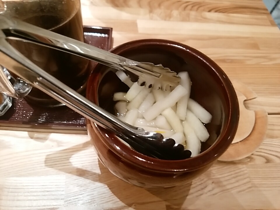 卓上には、あのまるやの柚子風味の漬物が 壺で用意されている。美味しいんです。