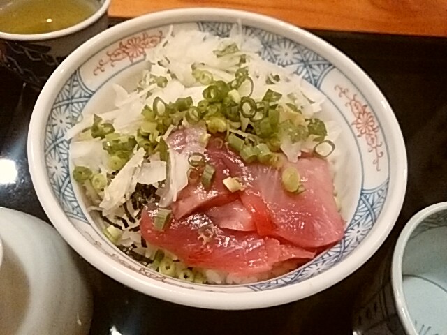 こんときは高知産初ガツオ丼、美味い。新玉ねぎや鬼おろし、あさつきが乗り薬味感を堪能できる。酢飯ではないけどそんな文句は言えない。