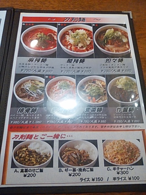 テーブル席10ぐらいの割と広い店内。カウンターはないが、ソロでも大テーブルで対応できる。奥の厨房で刀削麺を削っている姿が見られる。