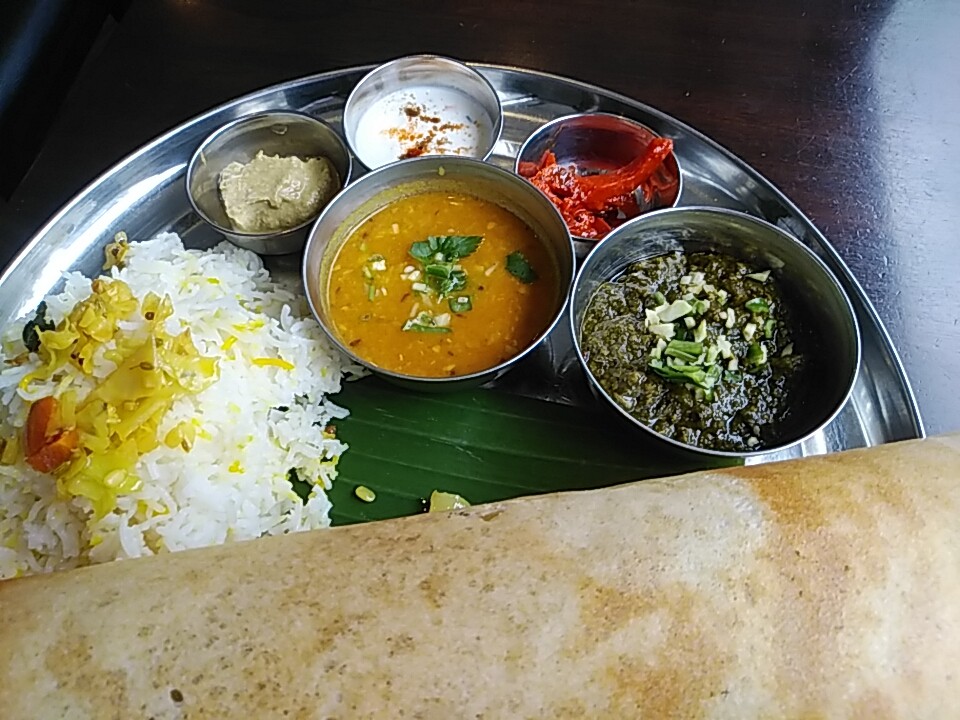 注文の品:南インドのドーサセット(サラダ、ラッサム、カレー2種、ソース他3、バスマティライス、ドリンク)