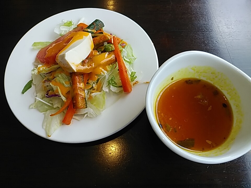 定番のサラダとラッサム(カレー風味スープ)。ラッサムはサービス。どっちも美味しいね。