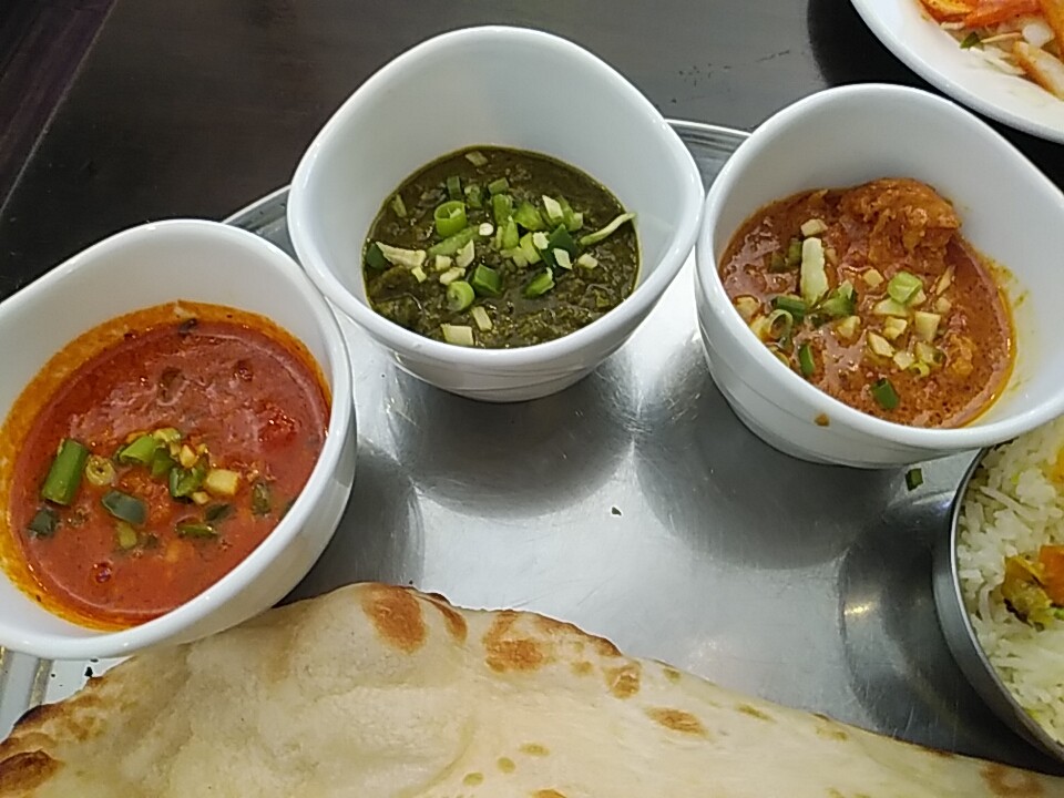 注文の品:三種類のカレーランチ(サラダ、ラッサム、カレー3種、ナン・ライスお替り可、ドリンク)
