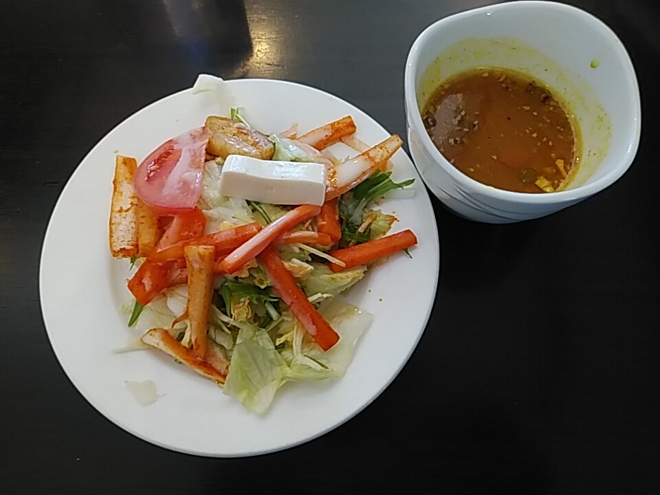 定番のサラダとサービス ラッサム(カレー風味スープ)。