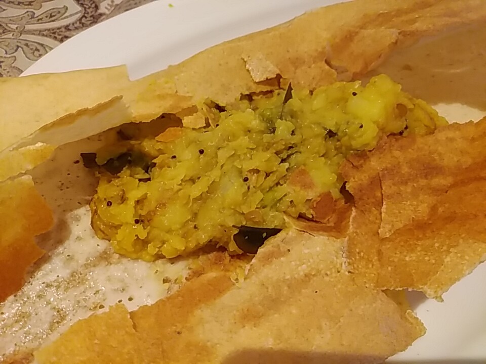 マサラドーサの中身。結構ボリューミー。インドレストラン モティ 新橋店 ランチ「マサラドーサ」、カーンケバブビリヤニの多品種感には及ばぬが、ドーサでかくコスパ的にも不満なし、満足でございました。