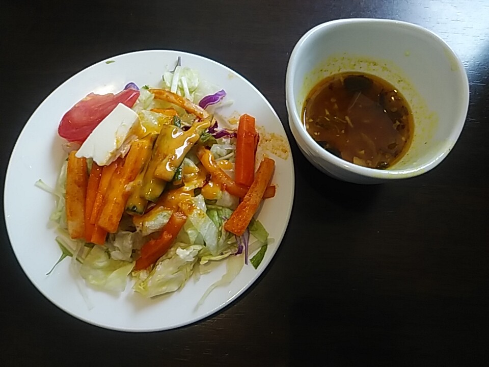 定番のサラダとサービス ラッサム(カレー風味スープ)。いいね〜