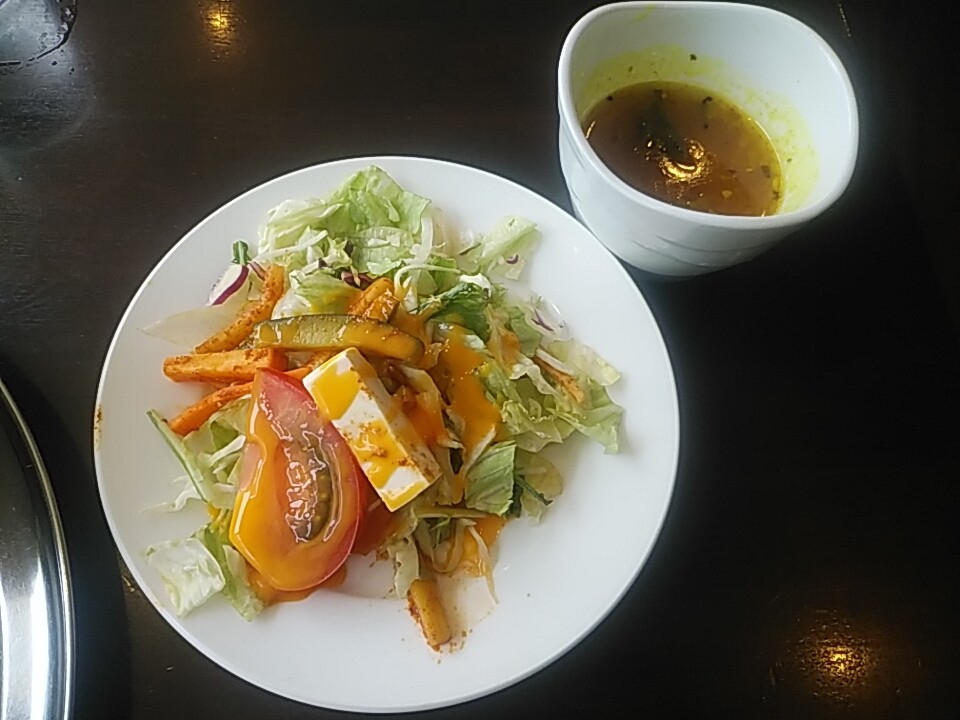 定番のサラダとサービス ラッサム(カレー風味スープ)。