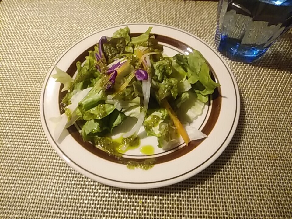 ドレッシングが緑色でバジルか?と思いきや全然違う。向こうの独特の風味で美味い。