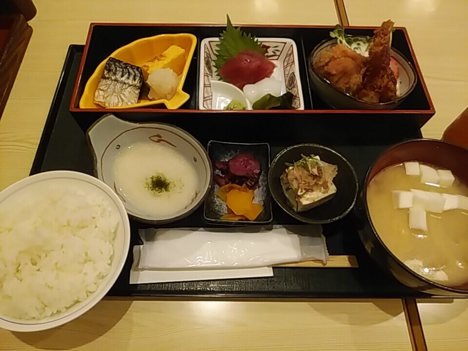 注文の品:ごだいご御膳(刺身、焼魚、揚げ物、とろろ、奴、漬物、ご飯・味噌汁お替り可)
