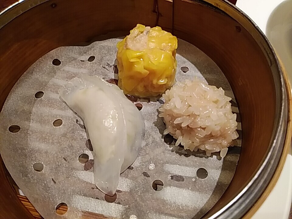 点心3種。レタス餃子と黄色は肉シュウマイ、エビとしゃきっとした根菜が入っており食感を堪能できる。あと餅米シュウマイ。