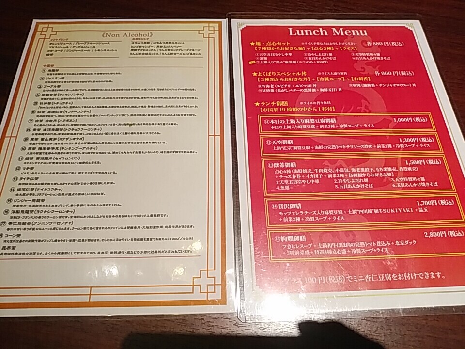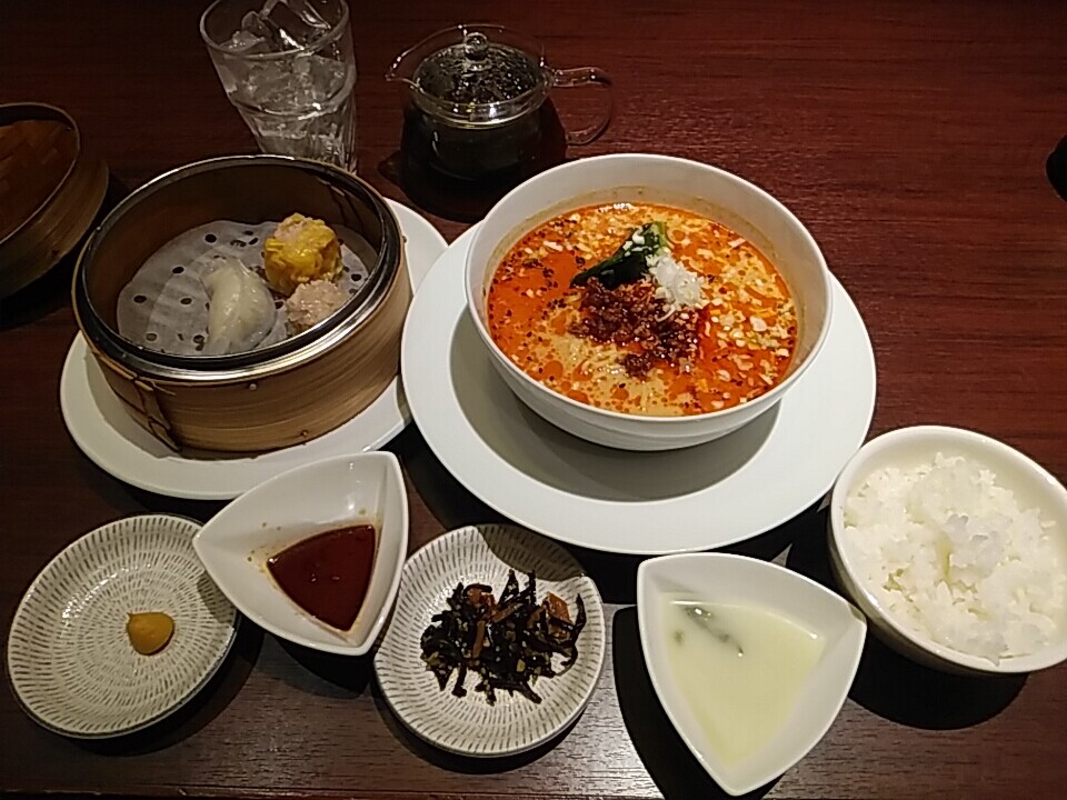 注文の品:<ランチ限定>麺・点心セット(麺1種選択、19種からの中国茶、点心3種、本日のスープ、小鉢、ご飯お替り可、杏仁豆腐(クーポン利用)、コーヒー)