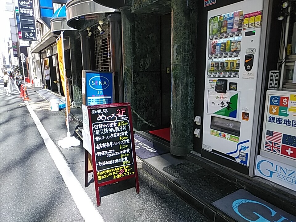 銀座の端っこほぼ新橋、あれ?見たことない看板が。銀座めぐろというややこしい名の鉄板焼き屋がランチを始めていた。