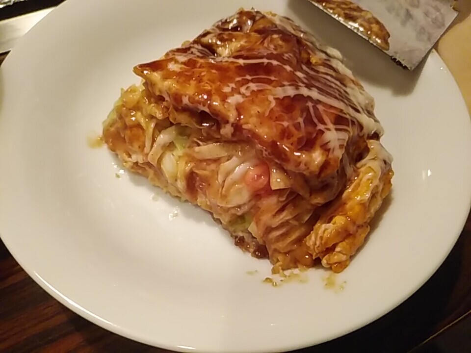 お好み焼きを ご飯のおかずとして立派に成立するのが実感させられた。関西人の気分になれた思い。