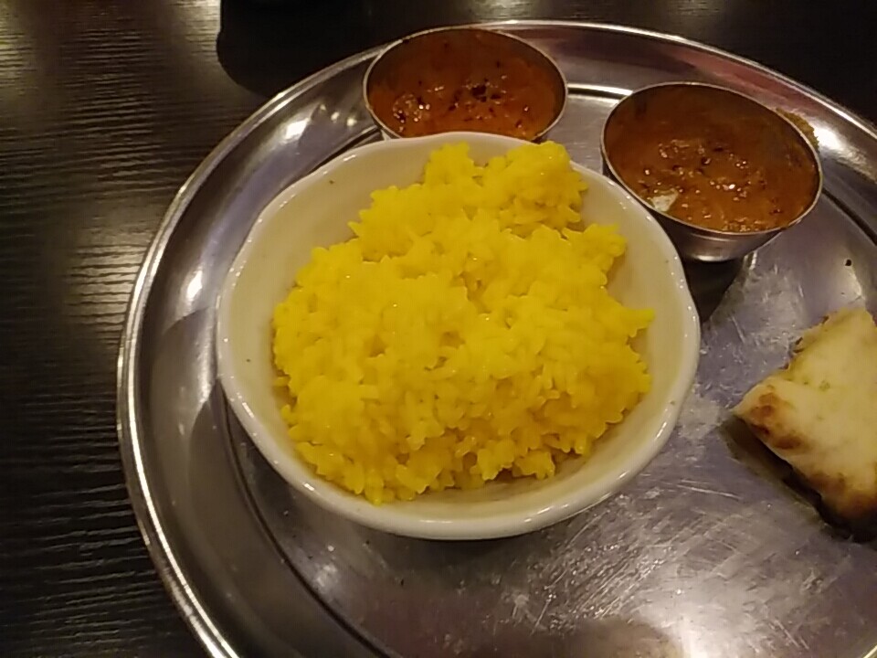 注文の品:チーズナンセット(カレー2種、サフランライス(お替り可)、サラダ、ドリンク)