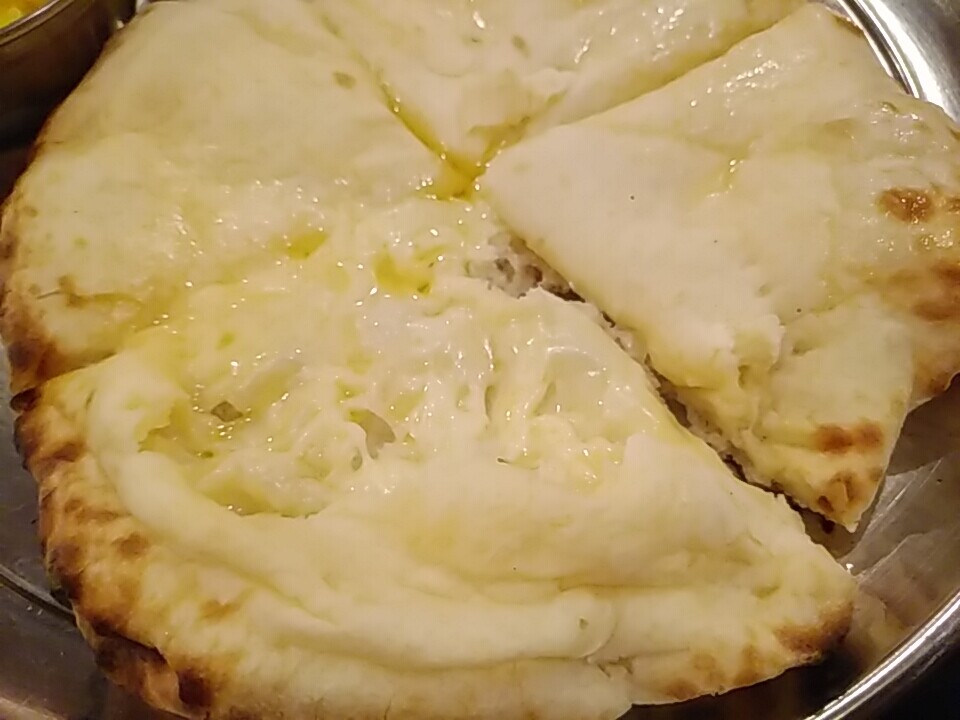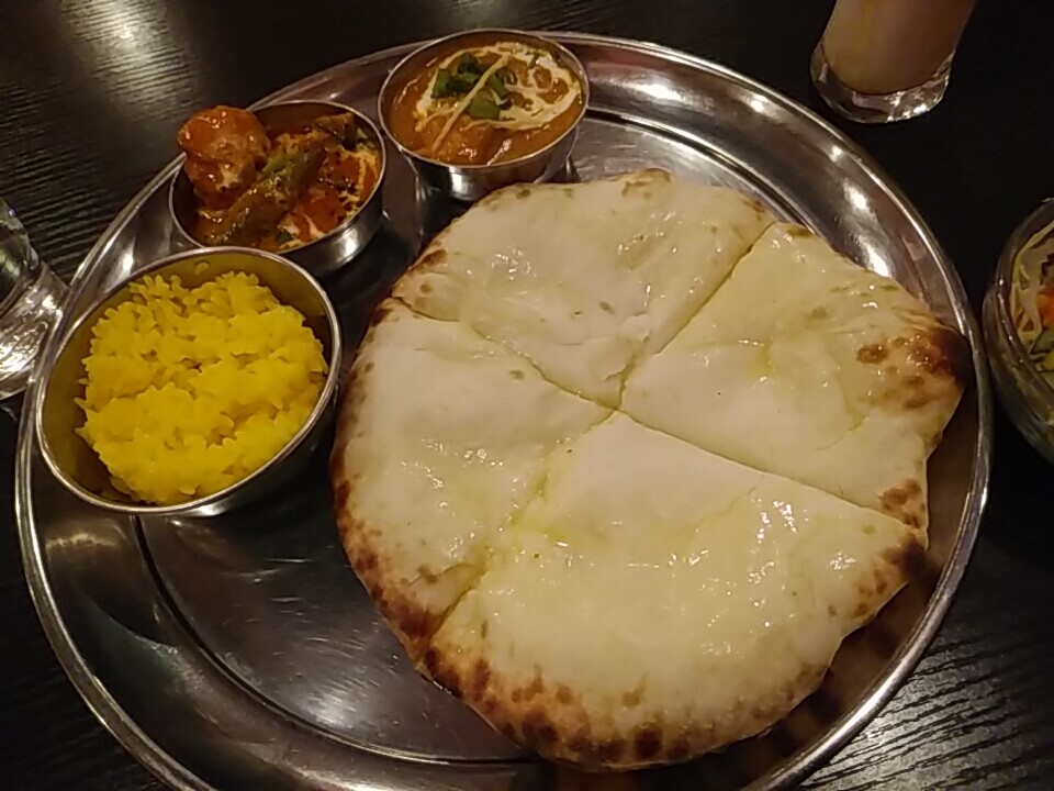 ニューナマステインディア新橋店のランチ「チーズナンセット」、大体チーズナンだけでも通常500円ぐらいはするので、これはお得である。満足でございました。オススメ
