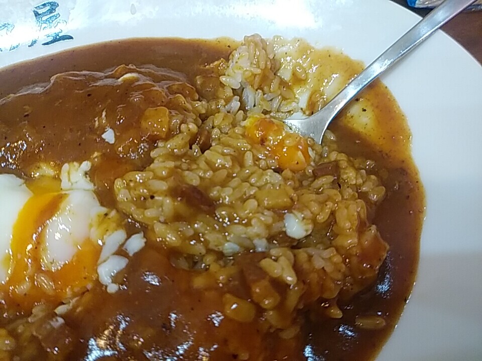 温玉を崩しとろ〜り。カレーは甘い仕様。後に辛味が来る。スパイシーさはほんのり。