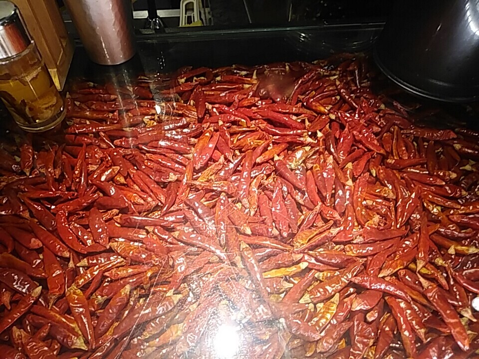 カウンターには唐辛子が敷き詰められている。ビク〜リ
