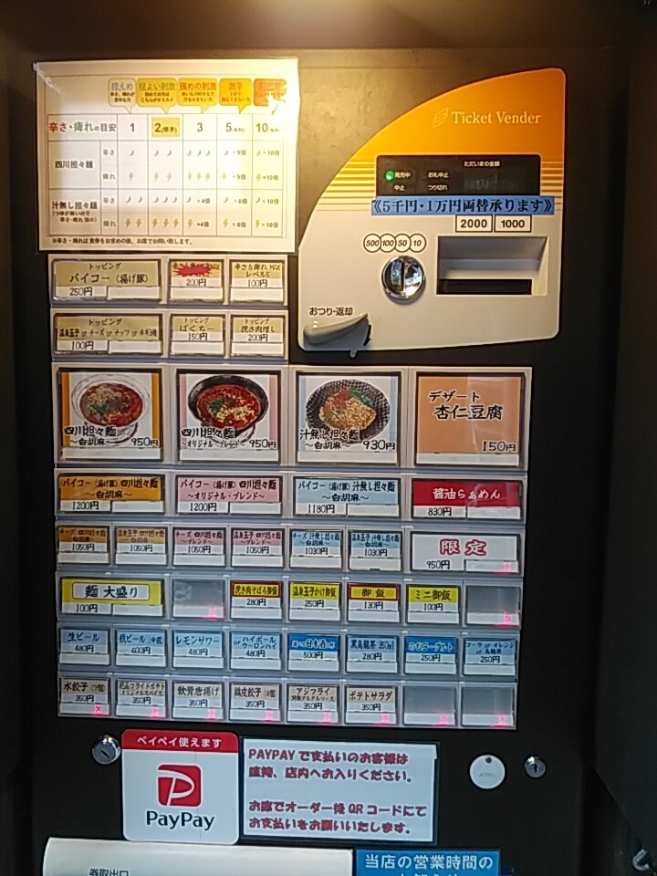 券売機のシステム。辛さ、痺れの目安が掲示されている。