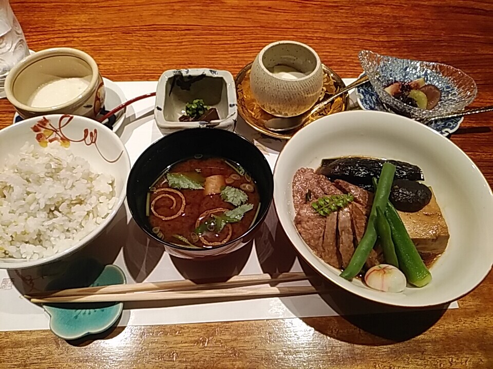 ご飯はもち麦入りでお替り可良心的。とろろも付く。漬物もちゃんとしている。蒟蒻煮が居た。味噌汁は赤出汁でこれまた美味しい。
