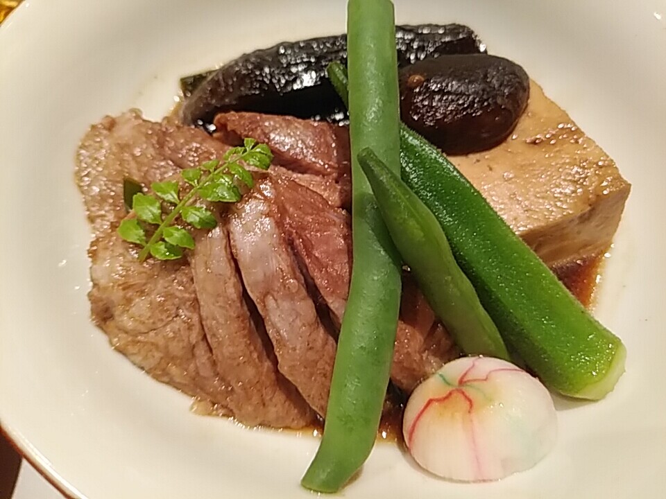 そんで、インゲン、オクラ、茄子、椎茸、豆腐 などなど居り充実。盛り付け丁寧。お麩が可愛いね。