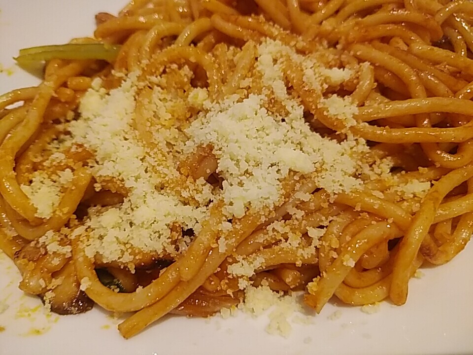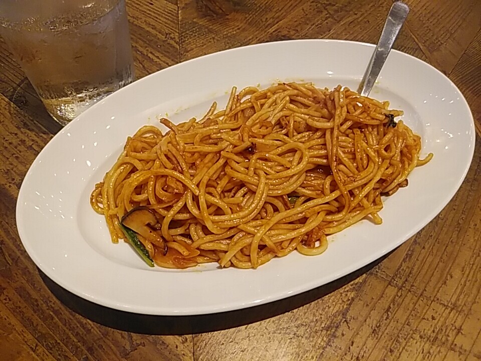 ナポリタン、いい感じです!( ゚∀ ゚) 具材は海老、玉葱、椎茸、小松菜。