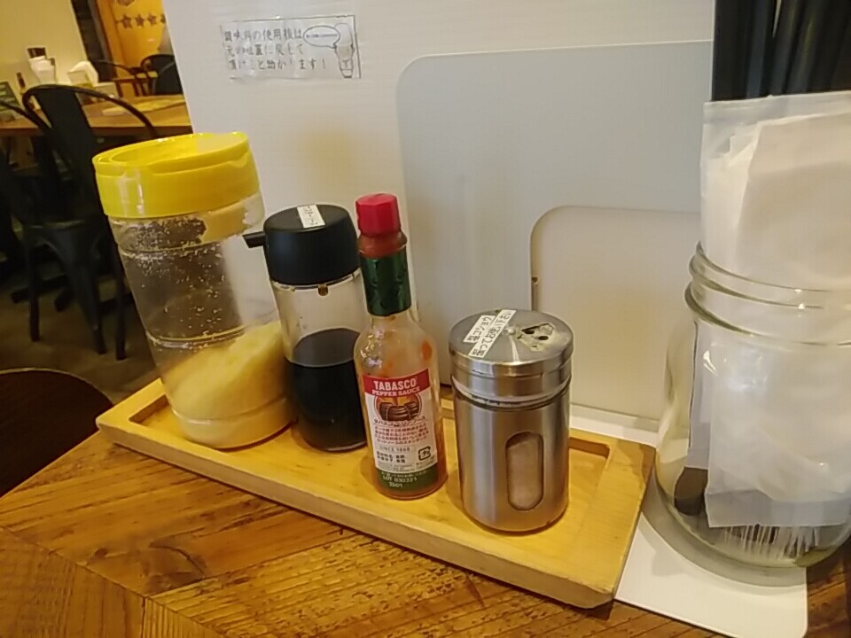 卓上に諸々アイテムがある。粉チーズの容器が怪しい。臭味があると思いきや・・