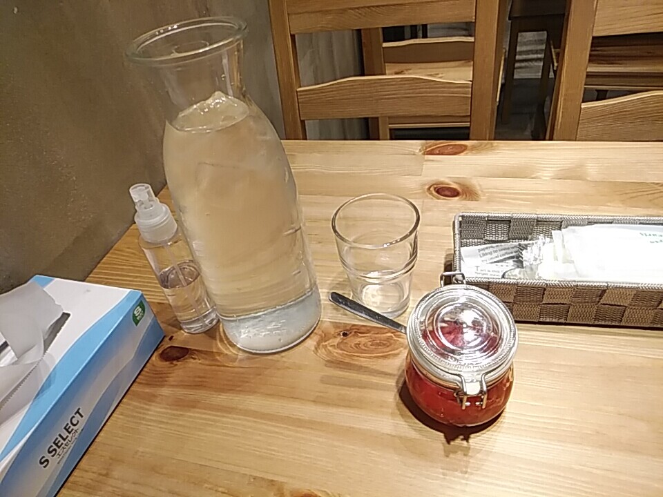 B1、カウンター3、テーブル席4程。水ボトルが嬉しい。