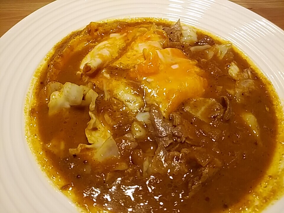 ポークスパイスは豚肉とキャベツ入り、そして目玉焼きが乗る。