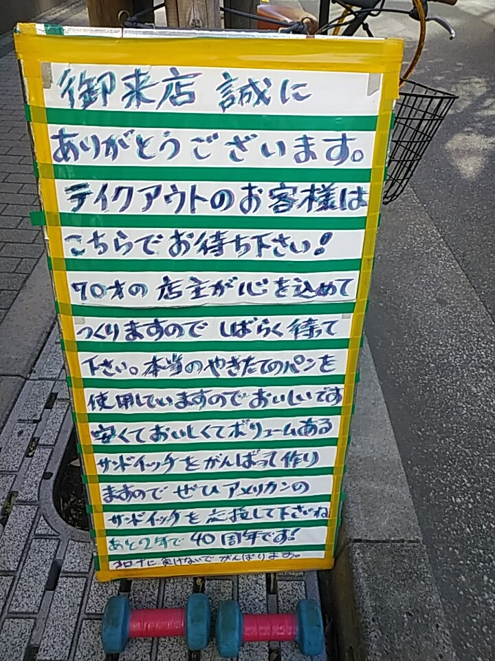 70歳の店主が頑張ってサンドイッチ作っている掲示。ホント頑張ってほしいですね。