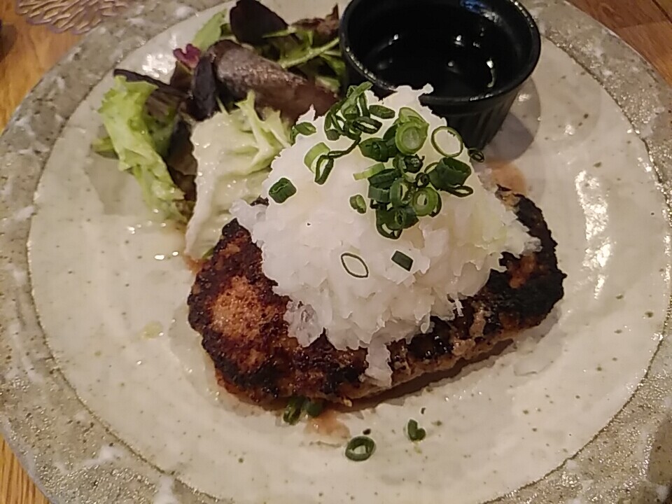 注文の品:鬼おろしポン酢ハンバーグ(羽釜ご飯お替り可、漬物、味噌汁、生玉子、食べるラーユ・自家製ふりかけフリー)