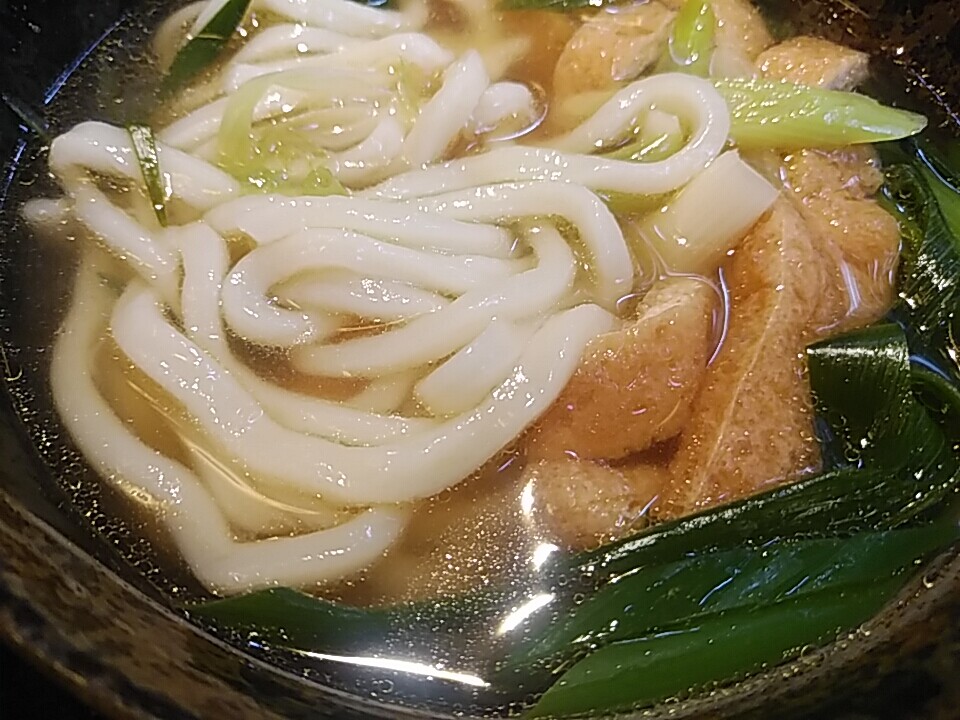 この京のきつねうどんが、甘めの刻みお揚げと九条ネギがたっぷりで、とてもイイです。九条ねぎは青臭くないのがいいんだよね。