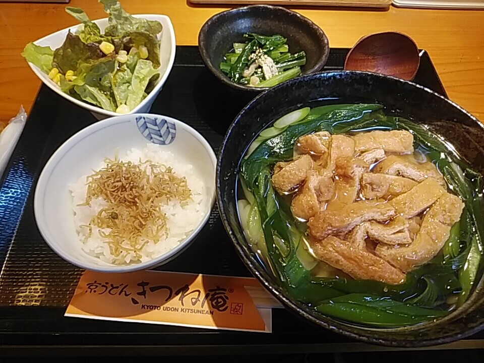 注文の品:ランチ 京のきつねうどんセット(サラダ、おばんざい、ちりめん山椒ご飯付き)