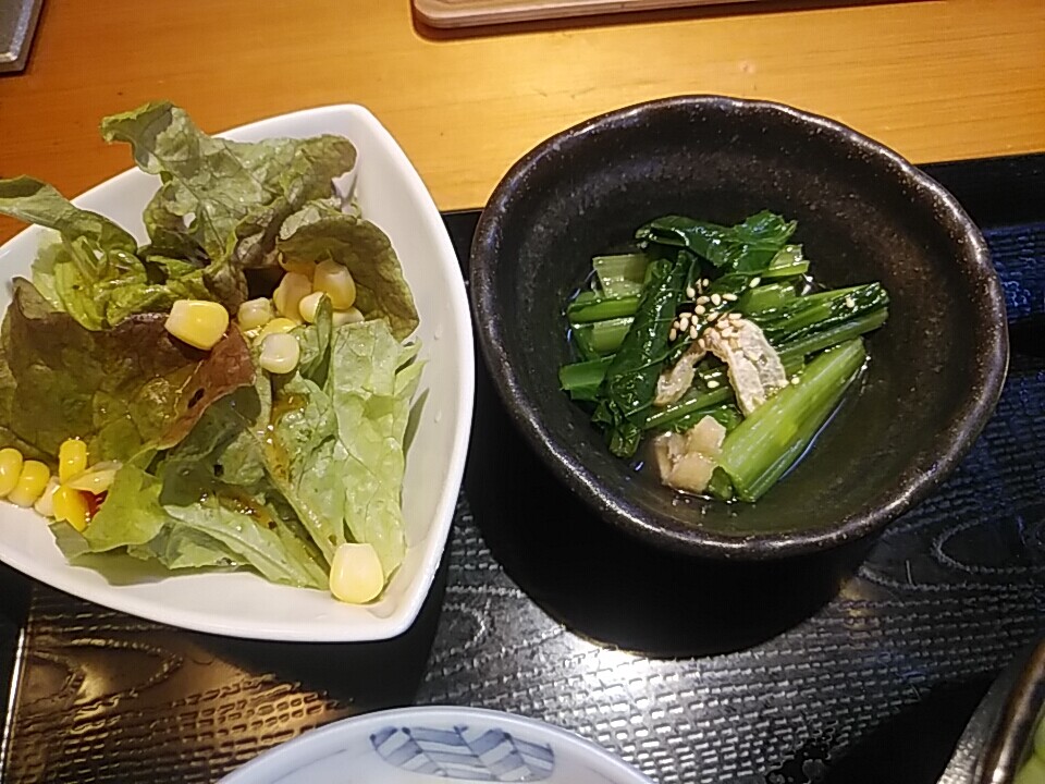 小鉢サラダと小鉢、冷や出汁のおひたし。