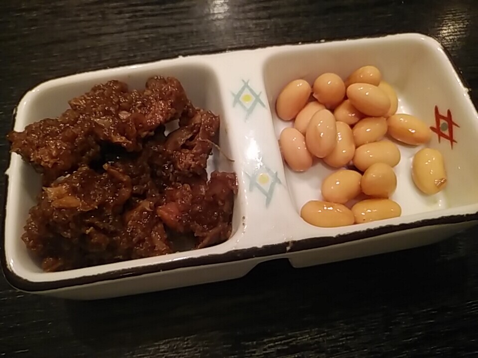 小鉢はイカワタの風味がある魚内臓煮と煮豆。