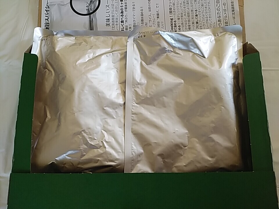 スープカレーはレトルトで、チキン、ホタテ、角煮の3種から2種選択できます。