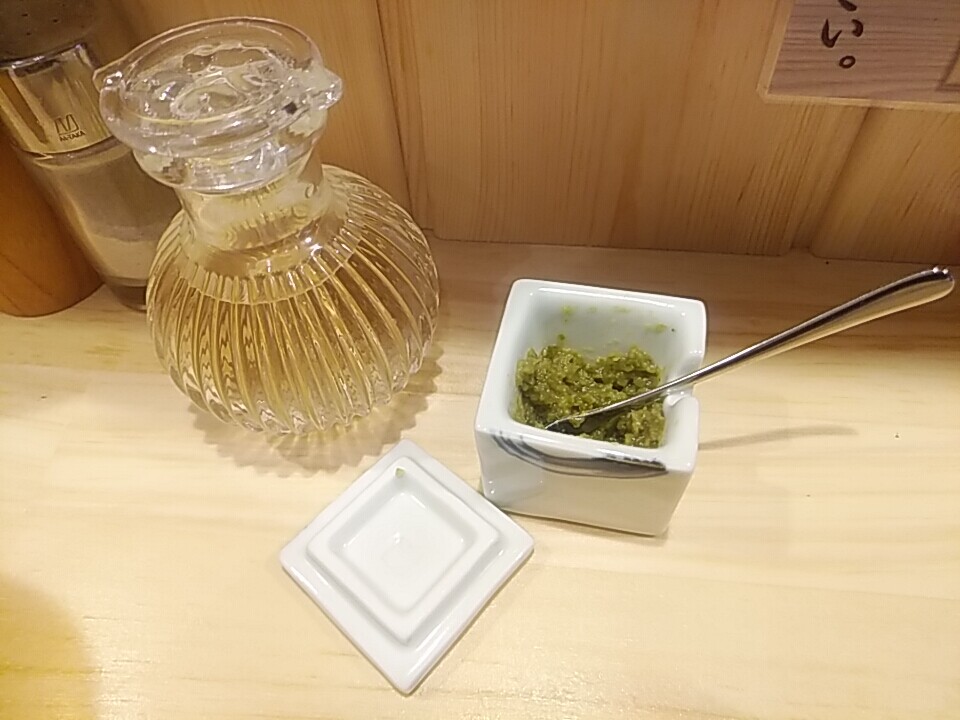卓上に柚子胡椒あり。後半味変で堪能〜。ただ、元々ちょっと塩気があるスープだけに、入れすぎるとしょっぱくなるので要注意。
