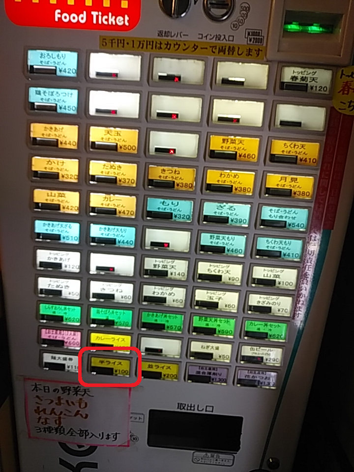 券売機の前金制です。半ライスの位置は一番下の左から2番目です!